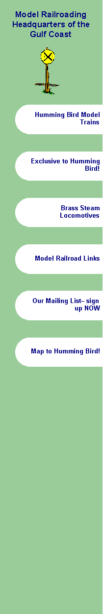 Humming Bird Model Trains, located in downtown Gulfport, MS, handles model trains exclusively and is run by railroaders for railroaders. We stock all scales, but specialize in HO and N scales, custom painting/lettering, and repair work.